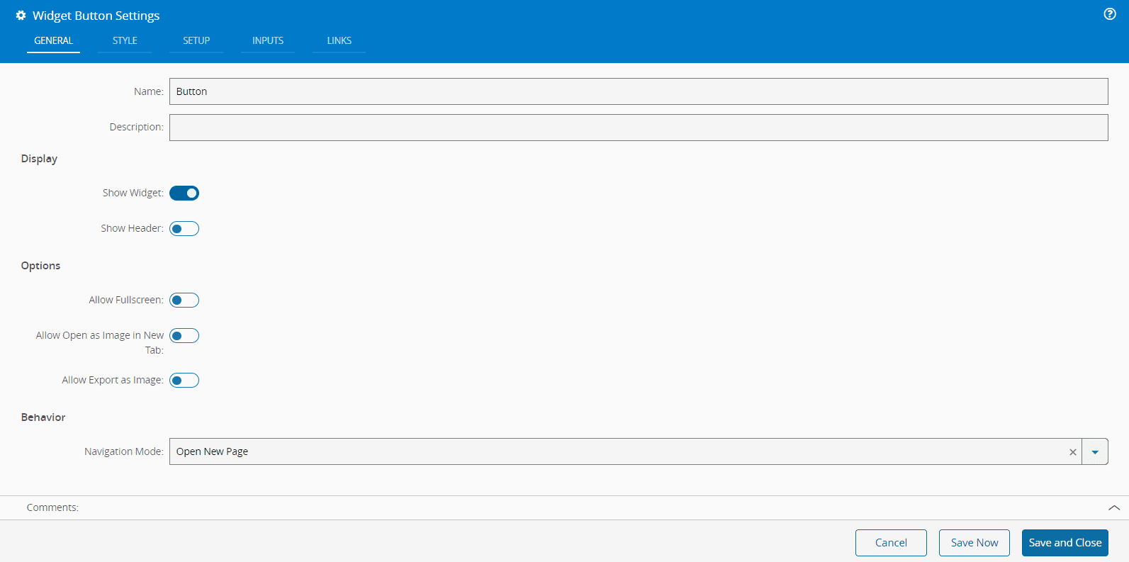 3. In the General tab, provide a name and a description for the widget. Use the toggle buttons to specify whether the widget should be visible, display the header, or allow full screen mode. Additionally, determine if the widget can be opened as an image in a new tab or exported as an image. You can also select the navigation mode behavior: open a new page, replace the current page, or none.