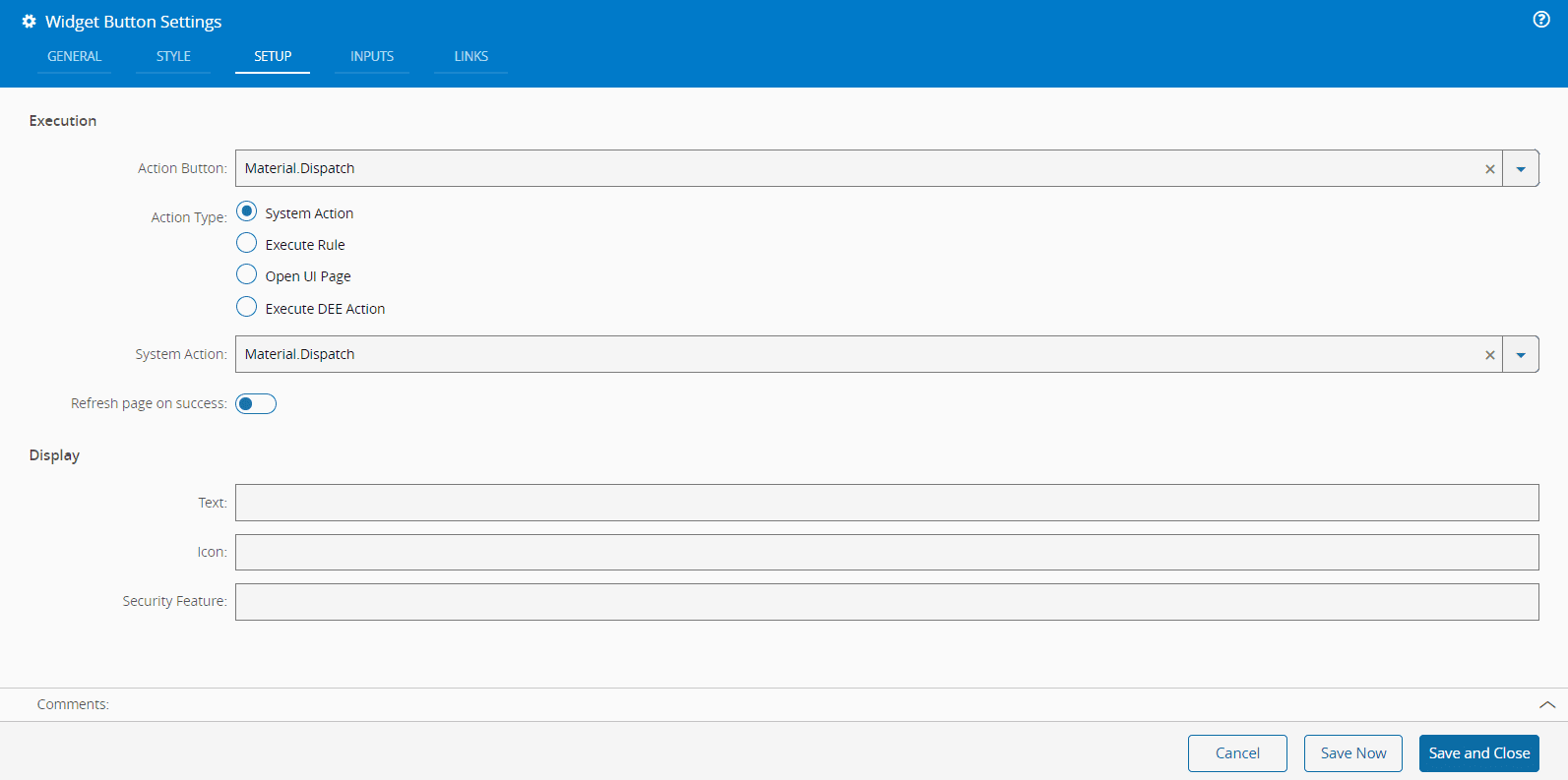 2. In the Setup tab, you can configure the button to perform one of four types of actions: System Action, Execute Rule, Open UI Page, or Execute DEE Action. For each Action Type, the system will show you the different options available, as shown in the images below. You will also be able to customize the Action Button even further by specifying the following options: