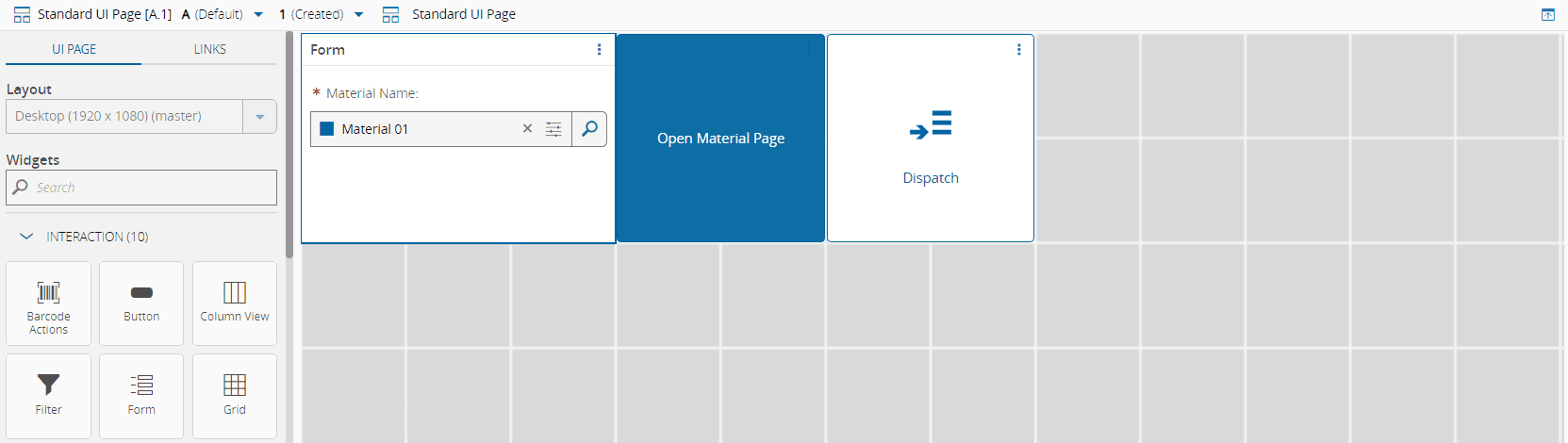 The Button widget provides a mechanism to execute an action in the system. An example is shown below, where a UI Page possesses three Button widgets to perform Material operations.