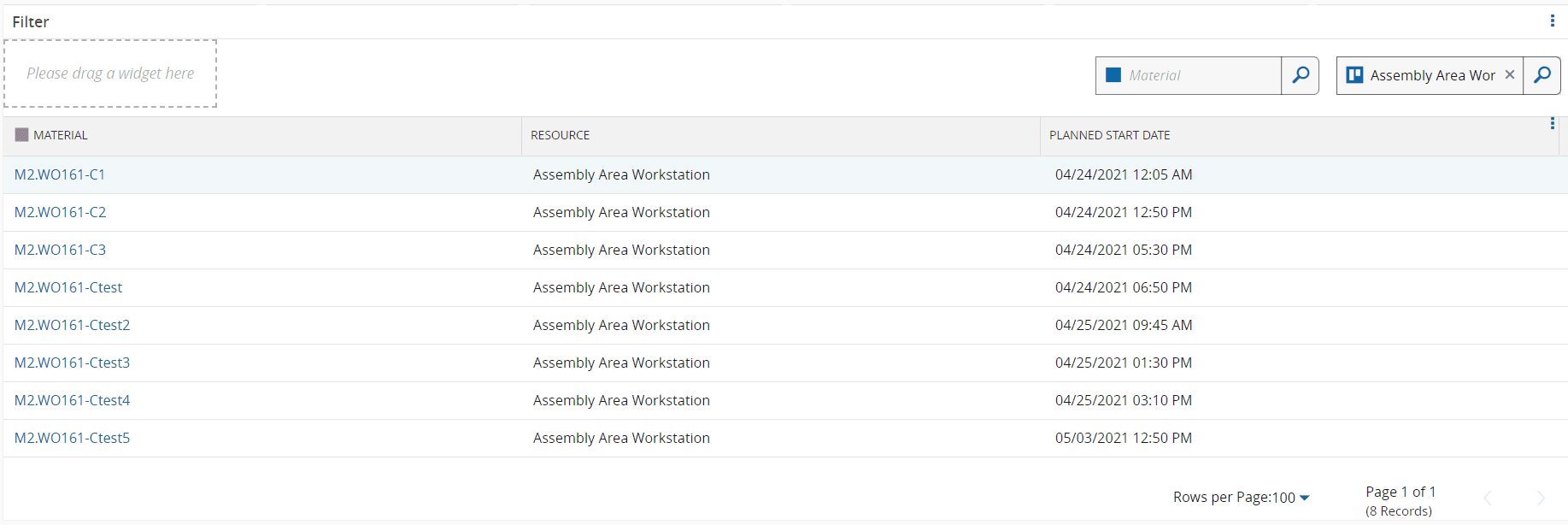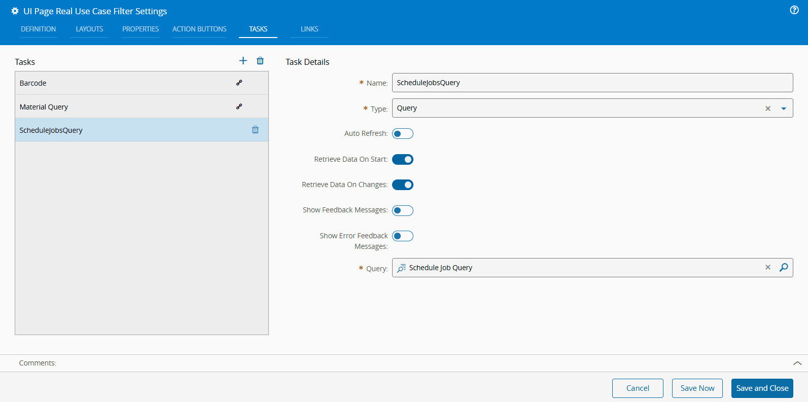 The listed scheduled jobs in the inner Grid can be filtered by the outer filter elements for Resource or Material. The inner Grid data is fed by a Query task for the Schedule Scenario Job entity. The system Query task GetMaterialsForResourceByStateForResourceView has parameters setup for Material and Resource.