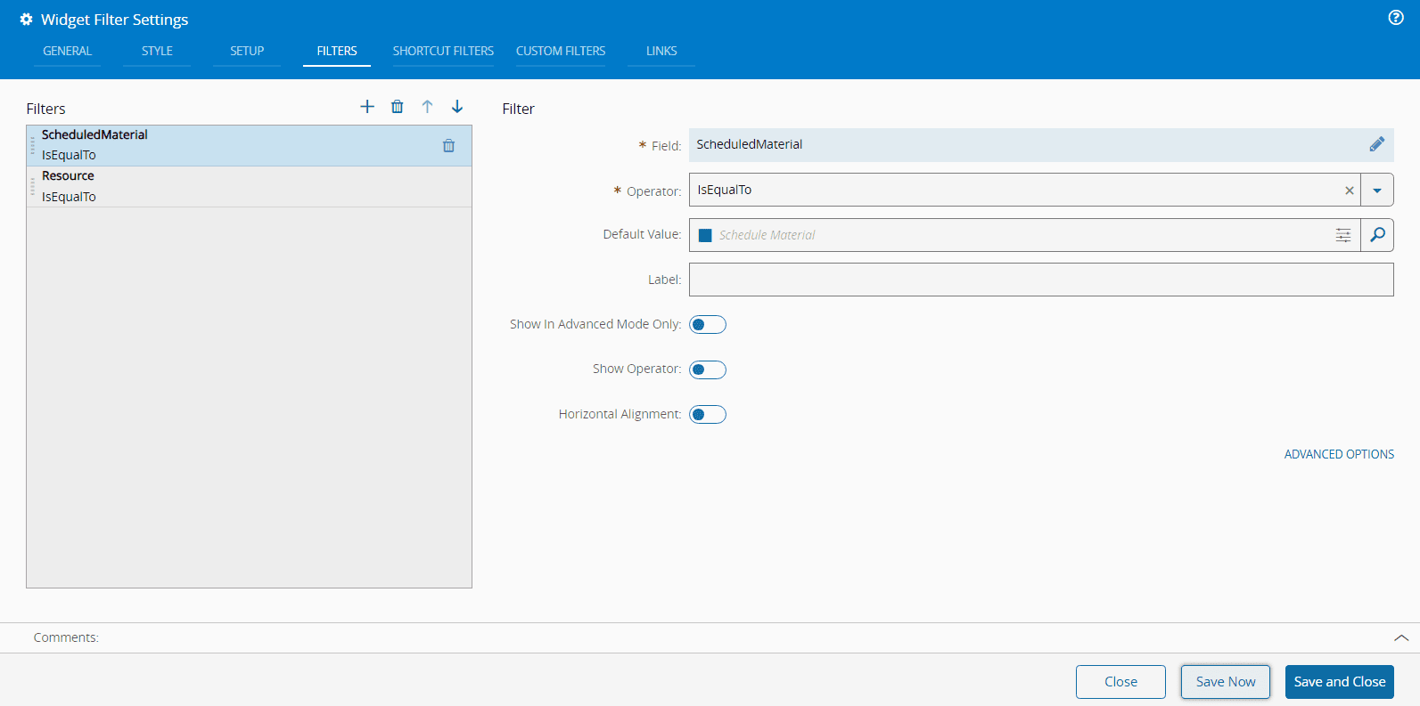 In the Custom Filters tab, define any custom filters you require. This list of filters will only be available in advanced mode.