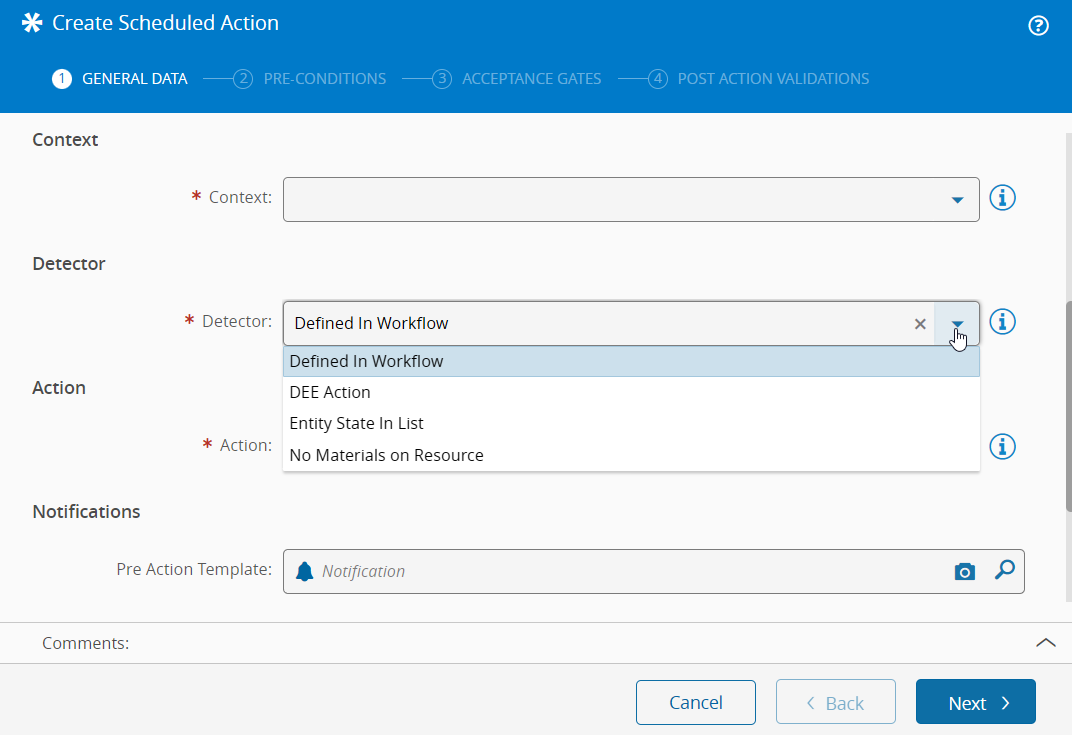 After the Context Resolution defines which entities enter the flow, and the Pre-Conditions filter task eligibility, the Detector evaluates the runtime state of each entity. It decides if the Scheduled Action can continue for that entity, preventing actions from executing while the entity is active, processing Materials, or otherwise not ready.