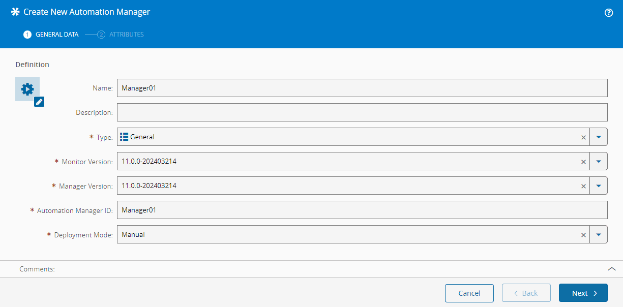 - Select the Automation Manager type. The list of possible values is taken from the lookup table AutomationManagerType.