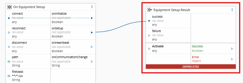 The Equipment Setup Result task is typically included in workflows that require equipment setup validation before driver communication begins. It communicates the outcome of an equipment setup process to the corresponding driver, and is automatically added to the workflow when the driver is created and is used only by that specific driver.