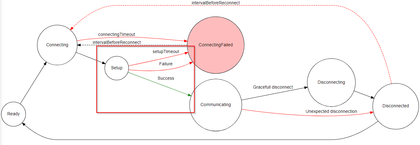 successinput is triggered, the driver transitions to theCommunicatingstate. - When the setup fails, the