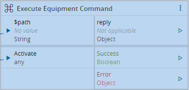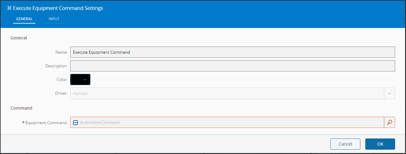 This task executes a command on the equipment. The command must be defined in the driver definition. The task receives a set of inputs defined in the driver definition. If the equipment sends back a reply, it will be made available in the output.
