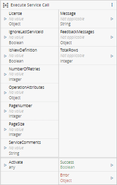 The image of the task is an example using the MES DeleteLicense service. If no service is selected the task will have no inputs or outputs, except for Activate, Success and Error.