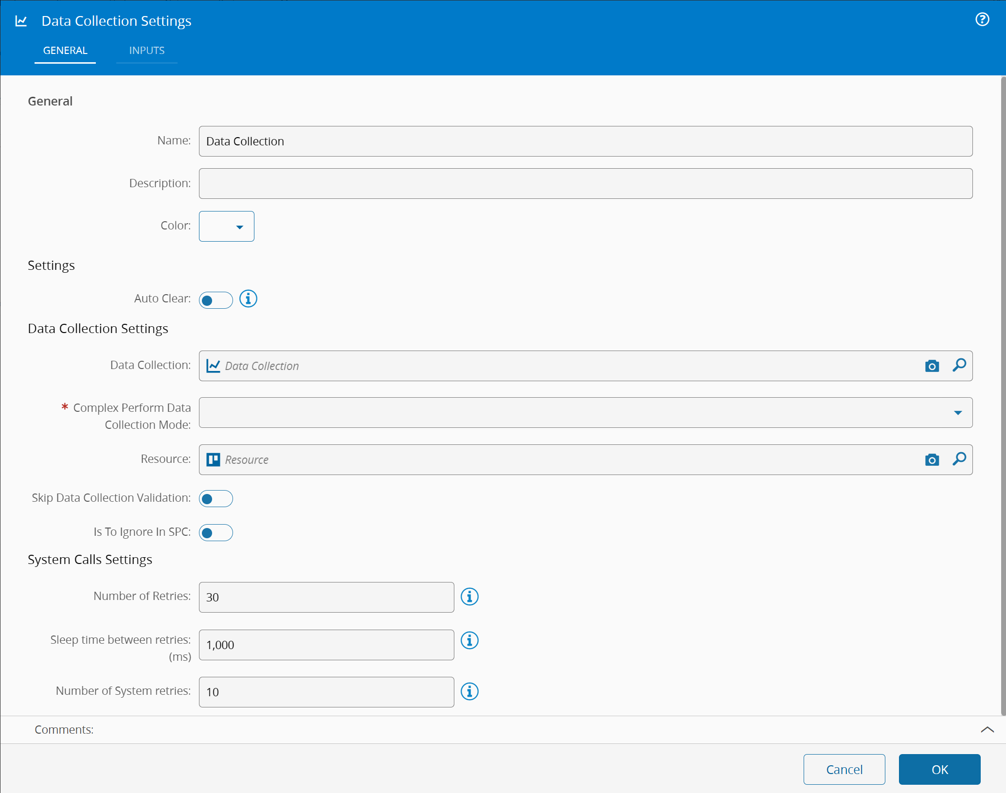 Selecting a Data Collection in the General tab will add one input for every defined Data Collection Parameter.