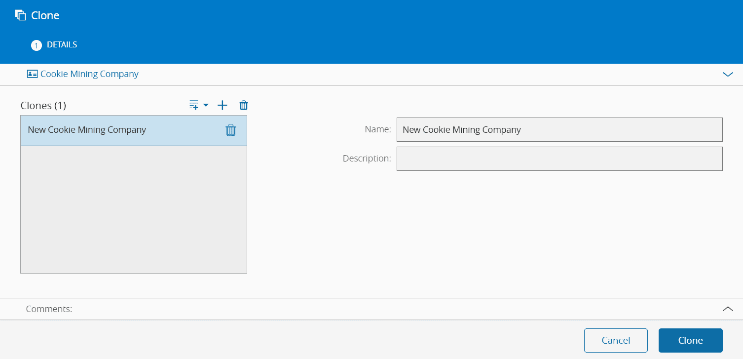 - On the left side panel, add as many rows as desired (each row represents a new Business Partner to be created based on the currently selected Business Partner) by selecting and specifying the property values for each new instance to be created. You can also provide a name for each of the new instances, however if a Name Generator is configured for the Entity Type, you can leave the field blank and a new name will be automatically generated.