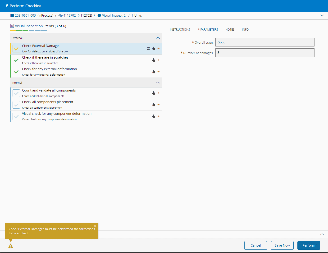 The Checklist Item must have been previously performed for any correction to be applied. If it has not been performed, a warning will be displayed on the bottom-left of the screen: