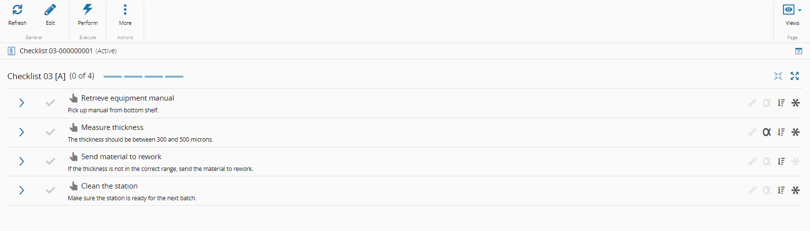 If the Checklist scope is Material Tracking, select the Perform New button, which will execute the Perform Material Checklist - New operation. You can also perform a Checklist when it is associated to a Material at any processing situation. If you choose to perform the Checklist from the Material, the button will be available on the top ribbon of the Material page in the Details view. For more information, see Perform Material Checklist and Perform Material Checklist - New.
