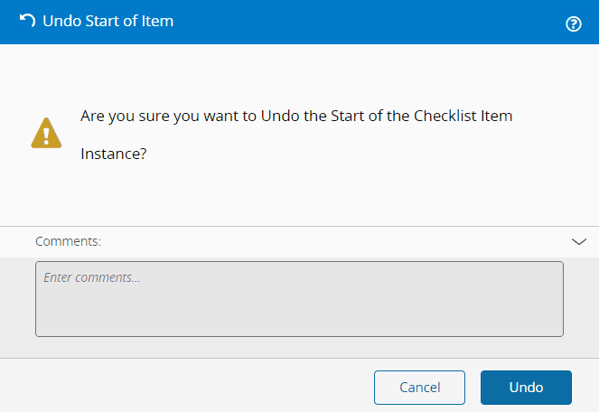 Optionally, you may add comments to the Undo Start of Checklist Item, as shown below: