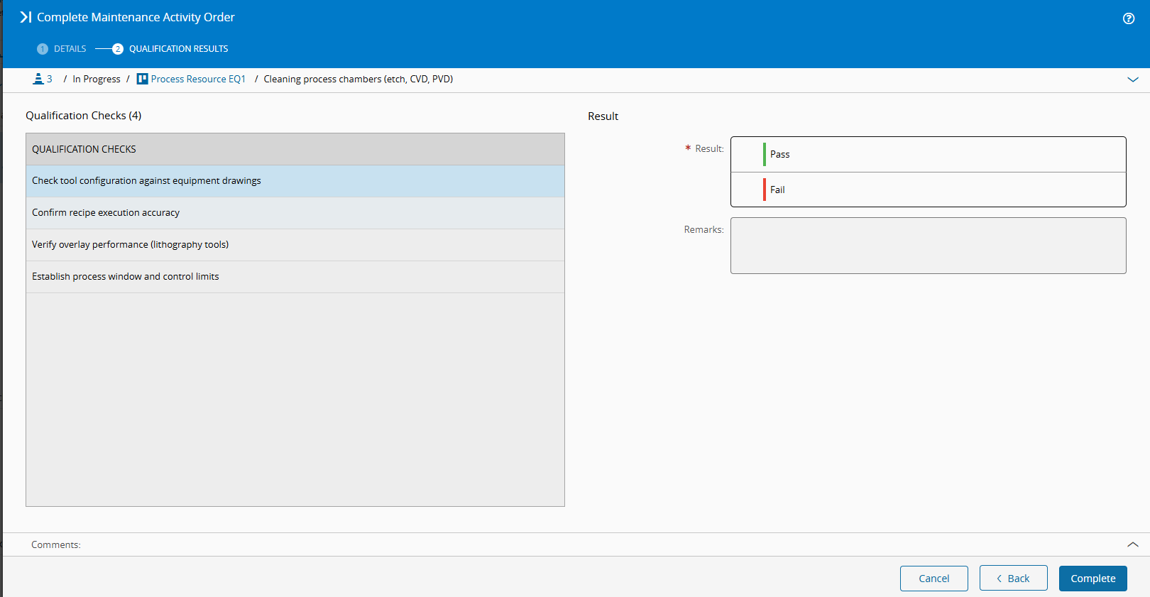 When the Maintenance Type of the MAO is set to Qualification and the Type Restriction Mode is set to Require None, you must record a Pass or Fail result for each associated Qualification Check, and optionally add Remarks.