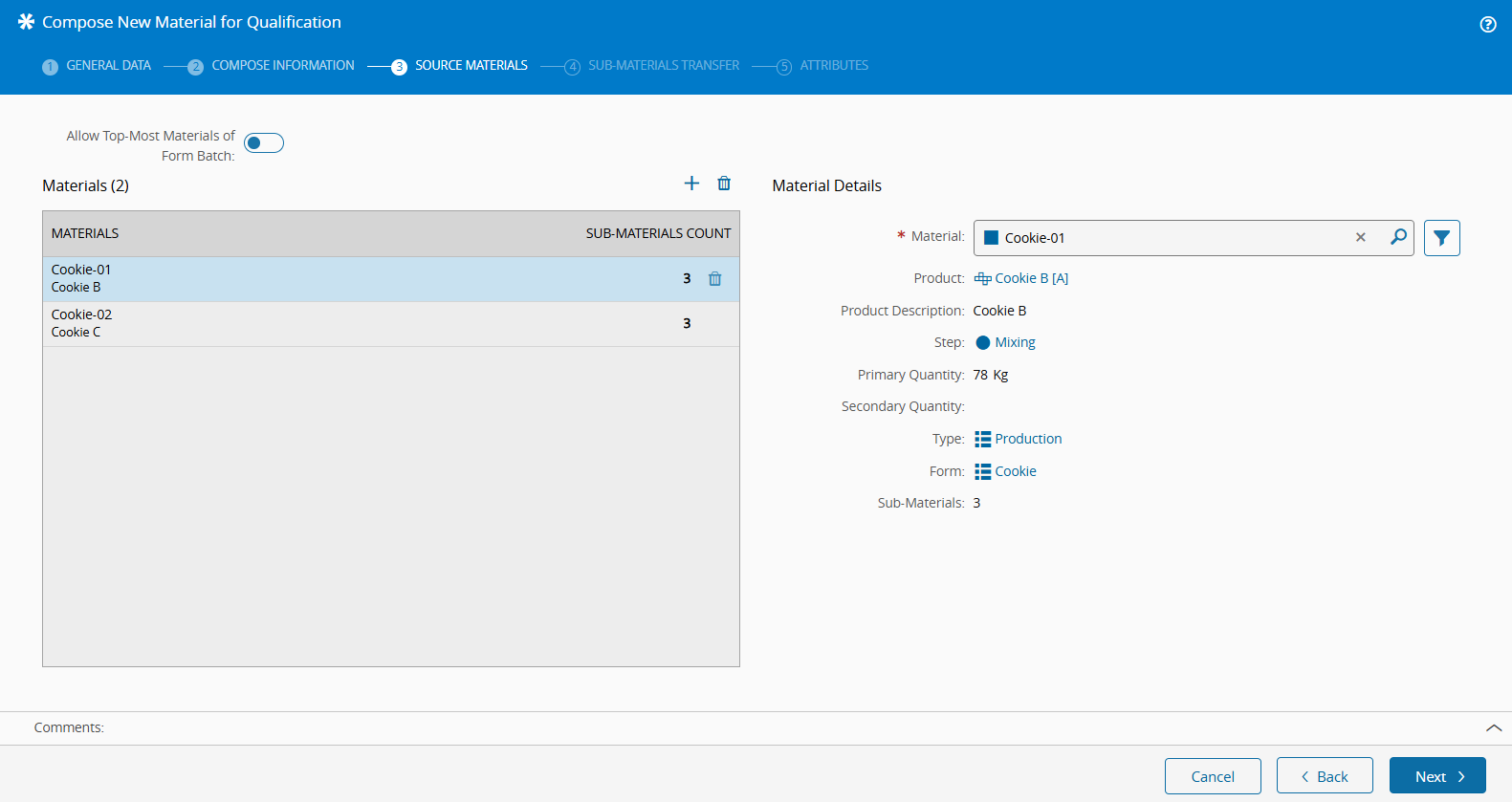 In the Compose New Material for Qualification wizard, provide the following information: