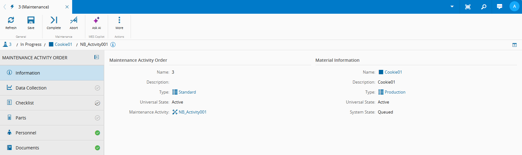 You can switch between the Information, Data Collection, Checklist, Parts, Personnel, and Documents by selecting the respective tab.