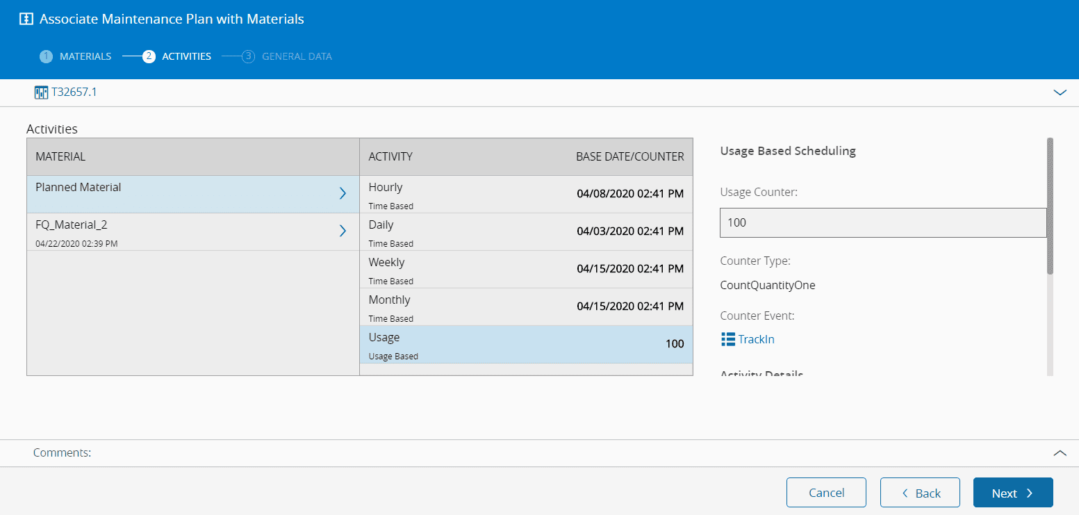 1. If wished, specify customized the Base Date and Schedule Mode for any of the Maintenance Activities that belong to the Maintenance Plan.