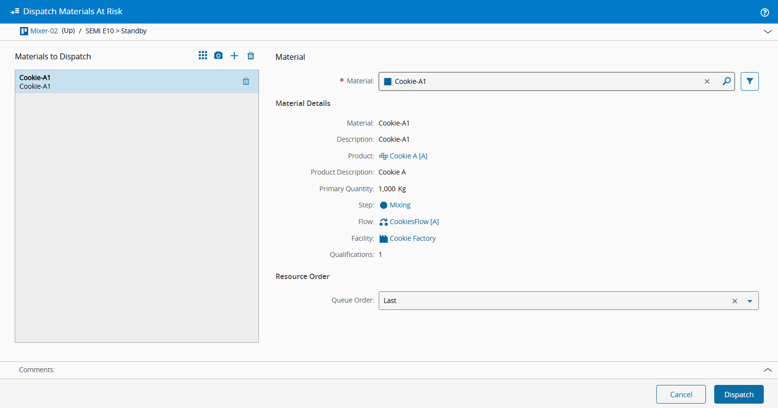 true, in this case a valid Lane of the Resource must be provided. - The Materials are dispatched to the same Resource and Lane.