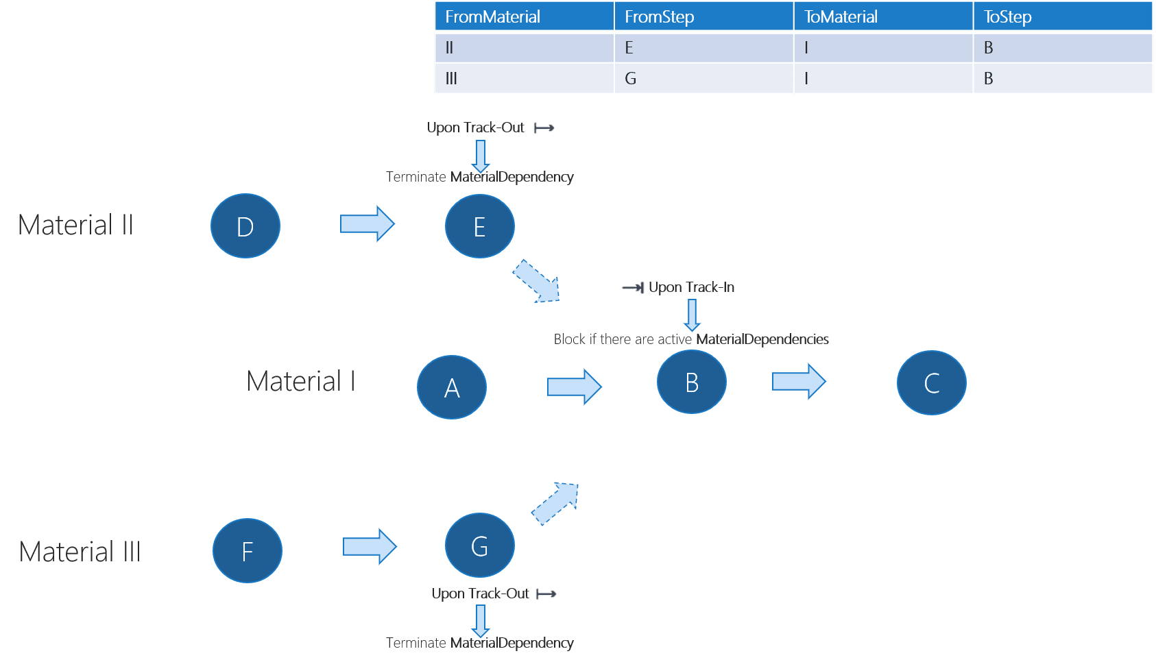 - During Track-in of the successor Material (To Material) at the chosen Step (To Step), the system checks if there any Material Dependencies referencing the pair (To Material, To Step); if so, an error is thrown. Therefore, to remove this obstacle, all the predecessor Materials (From Material) must have previously been Tracked-Out of the predecessor Step (From Step), which automatically closes any Material Dependencies containing that pair (From Material, From Step). This validation is exemplified in the following picture.