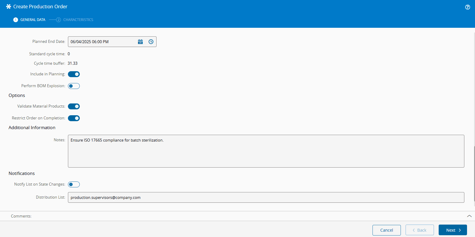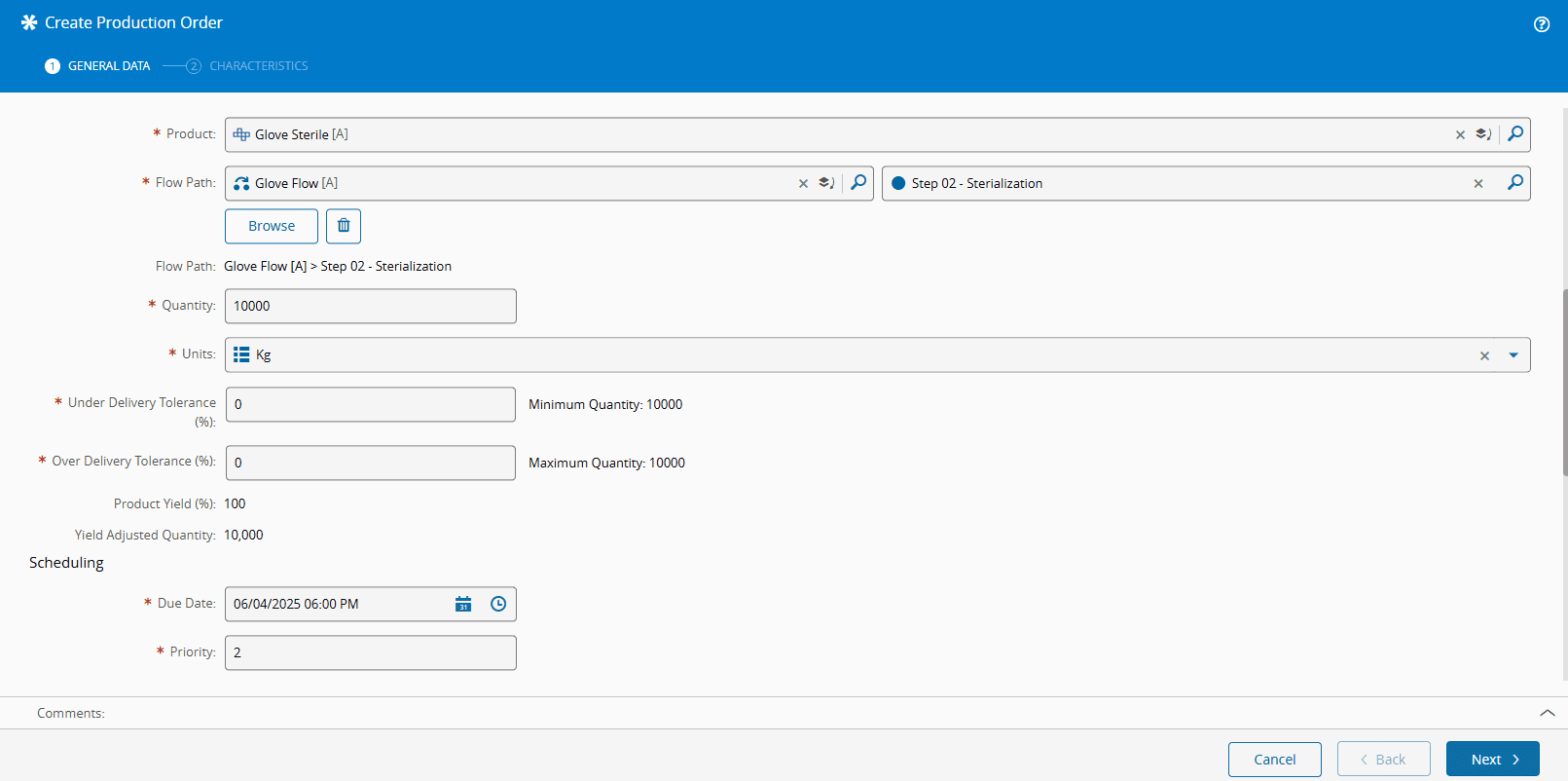 true, the mandatory Production Order Characteristics must be entered (see Step 2: Characteristics below). -