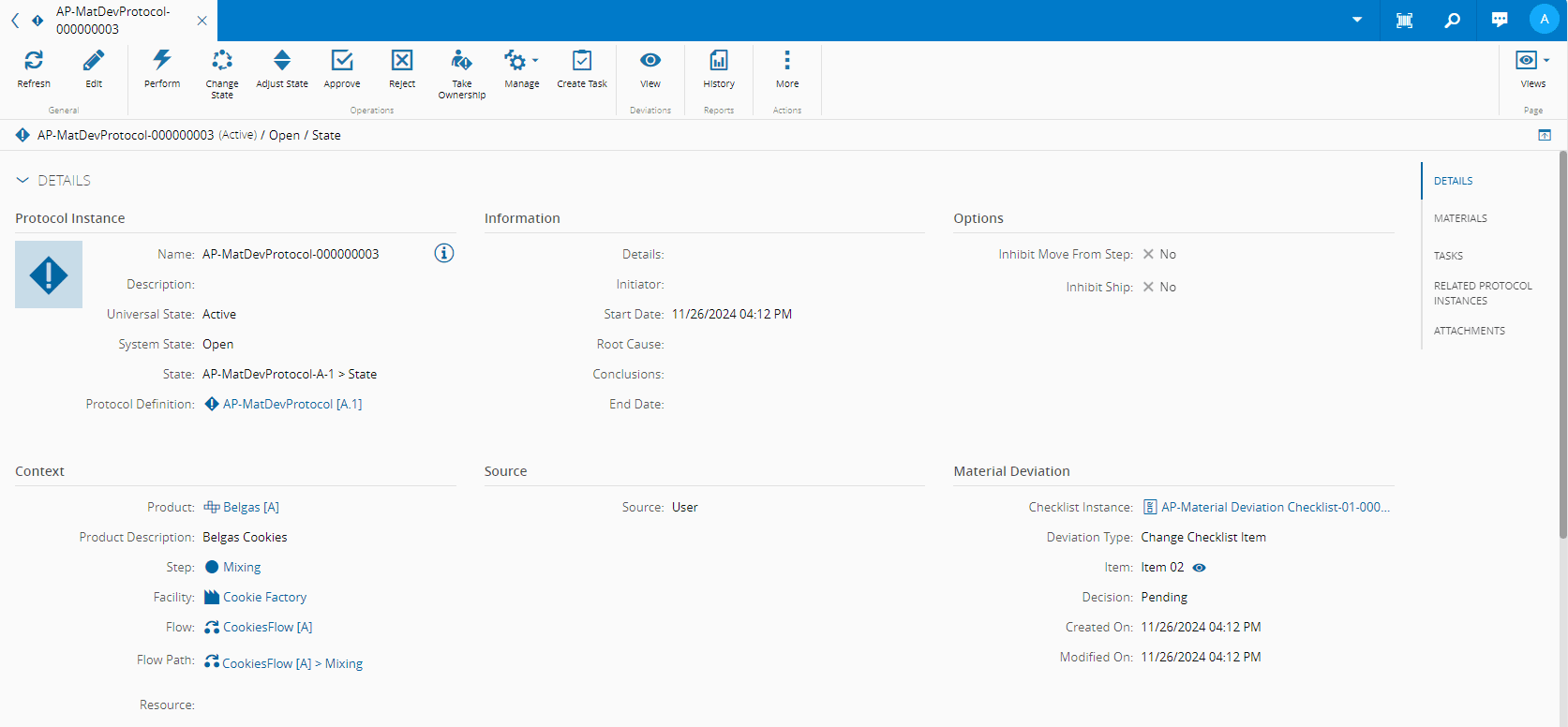 If the Scope of the Protocol is Material Deviation, the Execution View of the Protocol Instance will have additional operations available on the top ribbon: