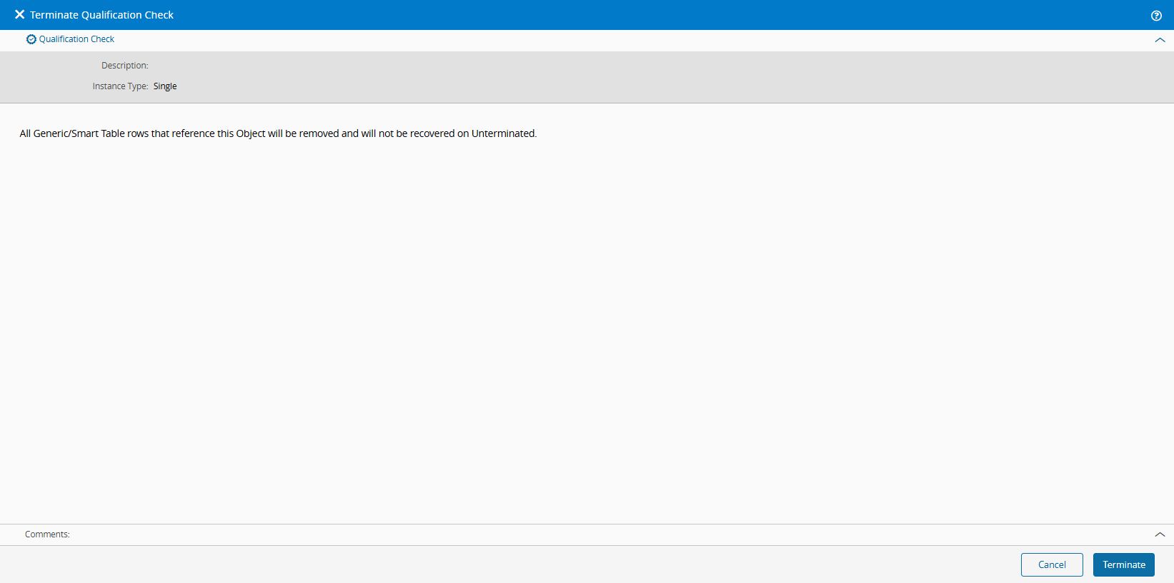 - Select Terminate to perform the operation. All generic/smart table rows that reference the current object will be removed and will not be recovered if the object is unterminated at a later point.