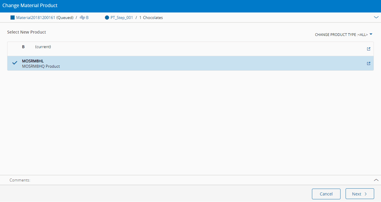 • If the Material is associated with a Production Order and if the Production Order has the property ValidateMaterialProducts set to true, the new Material Product must be compatible with the Production Order Product.