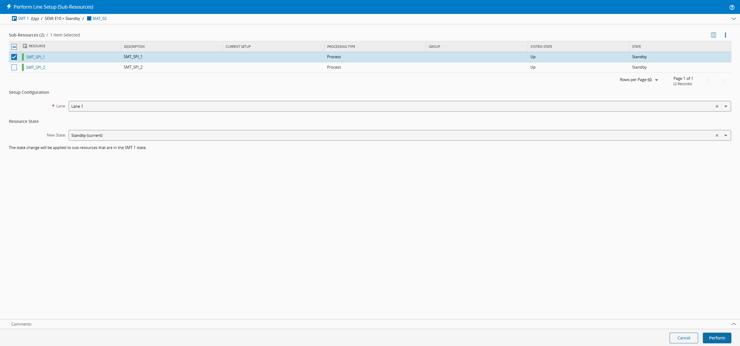 The Perform Line Setup (Sub-Resources) wizard will display the Sub-Resource(s) that are available to perform the line setup for the given Material:
