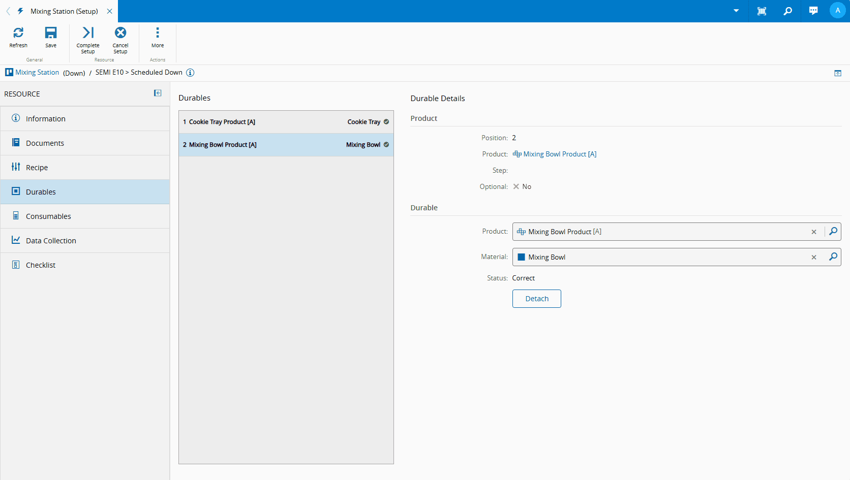 If the Setup Mode is different from Not Required (see preconditions), the Durables page will provide you with all the Durables information you need. The required Durables for the Material at that Step can be selected on this page, and a green check mark is shown if the durable is configured correctly: