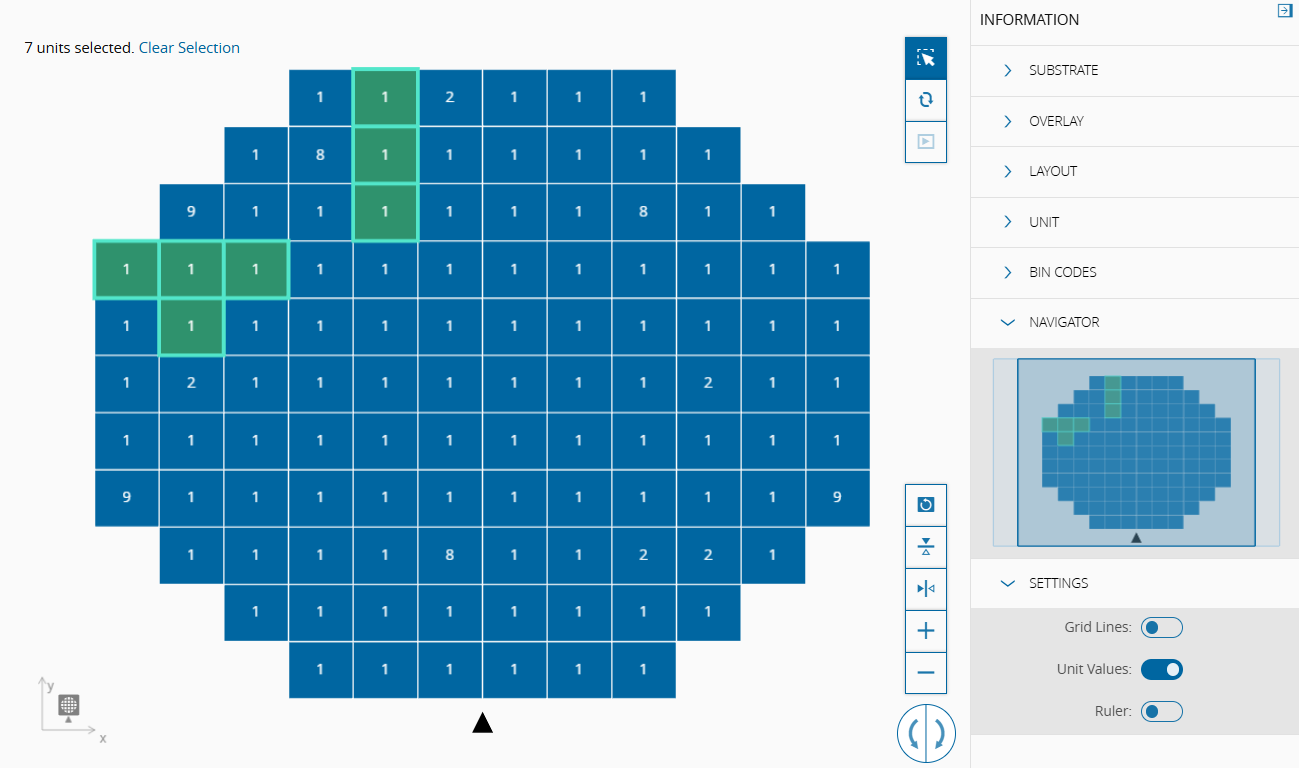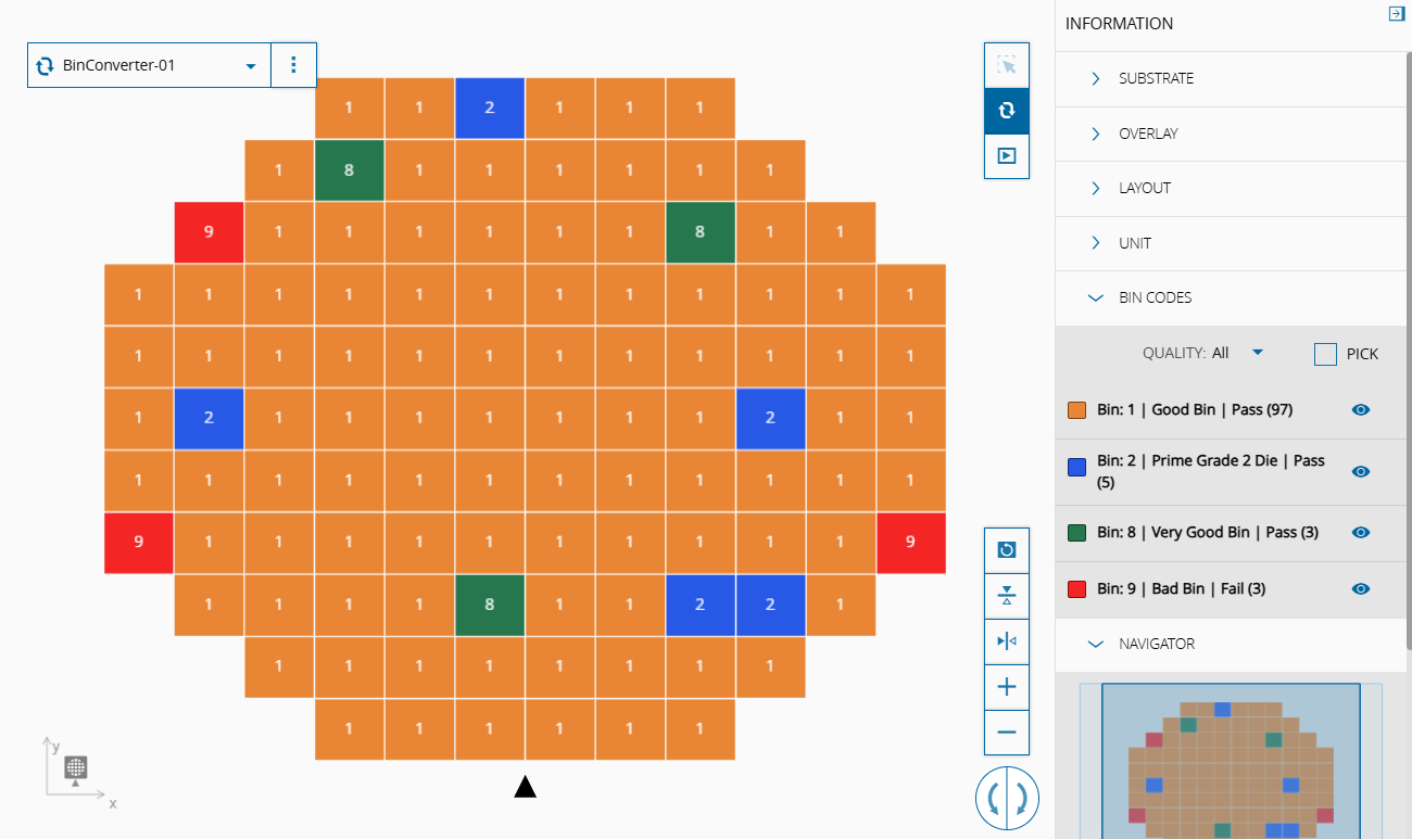 When applying a Bin Converter, the map will display the standard Pass and Fail Bin Qualities, as well as any Custom Bin Quality values defined. You can also filter the map by Pass, Fail, or any Custom Bin Quality.