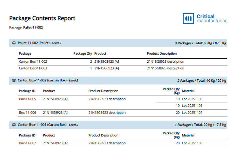 The Package Contents Report provides a hierarchical view of a package and all nested packages it contains. It displays key information such as package identifiers, quantities, products, and material composition. This Stimulsoft report can be accessed through the Business Intelligence tab, under the Material Logistics folder.