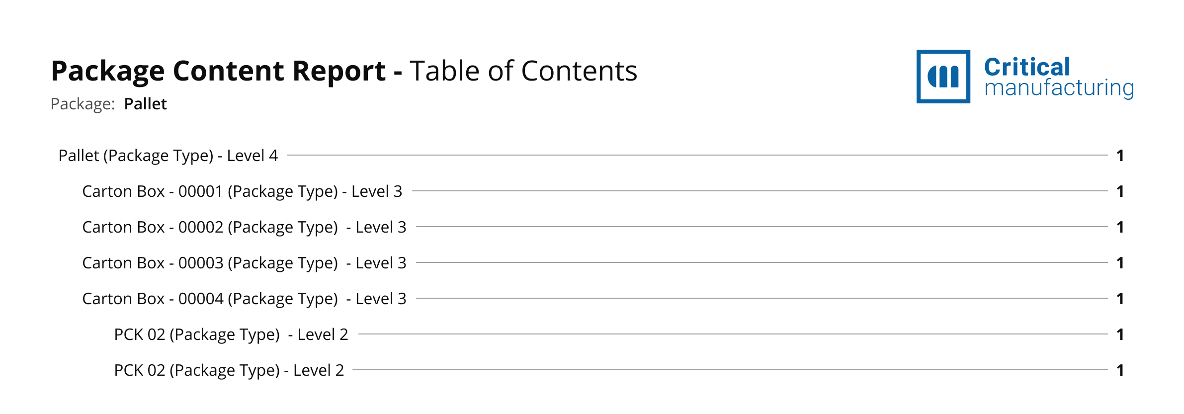 Optionally, you can choose to show the table of contents on the first page of the report. The table of contents lists the Package name, the Package type, and the Package level.