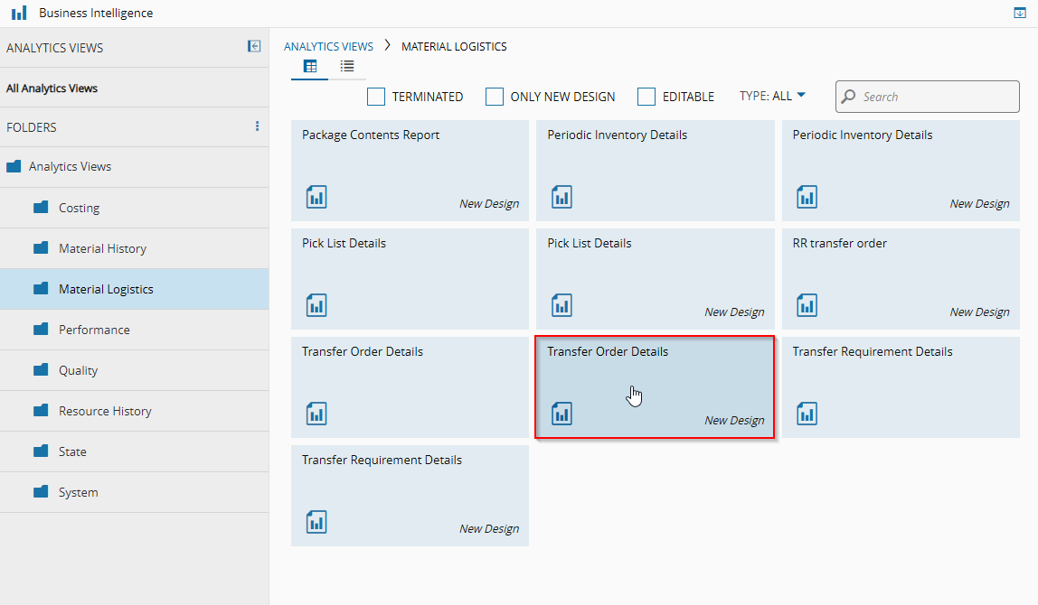 This report can be accessed through the Business Intelligence tab, in the Material Logistics folder.