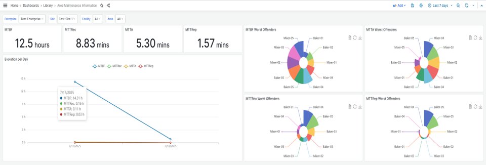 | Evolution per Day | Displays the daily trend of MTBF, MTTRec, MTTA, and MTTRep over the selected time range. | resource_states and resource_maintenance in Resource Cube |
