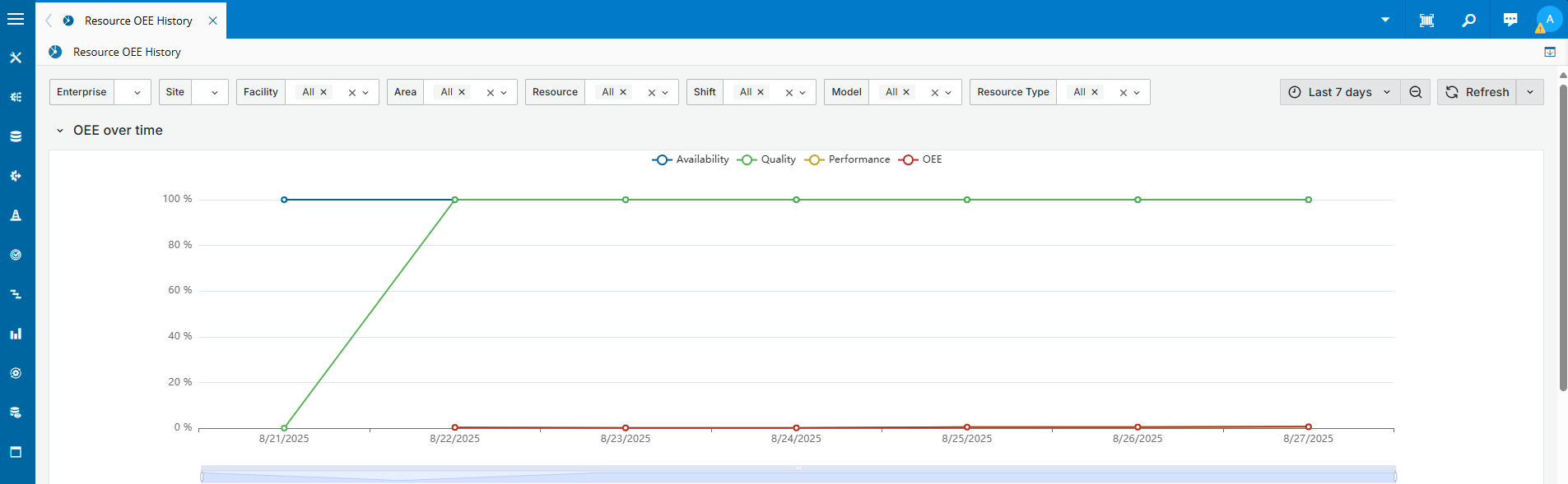 The Resource OEE History dashboard provides a comprehensive view of the historical performance of Resources using the Overall Equipment Effectiveness (OEE) metric.
