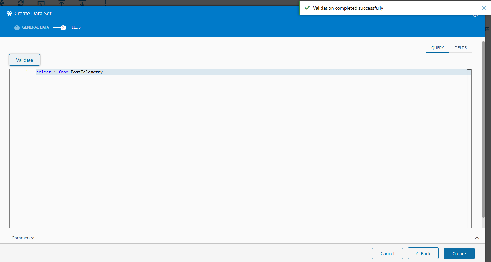 Select the Validate button to validate your query and retrieve the fields.
