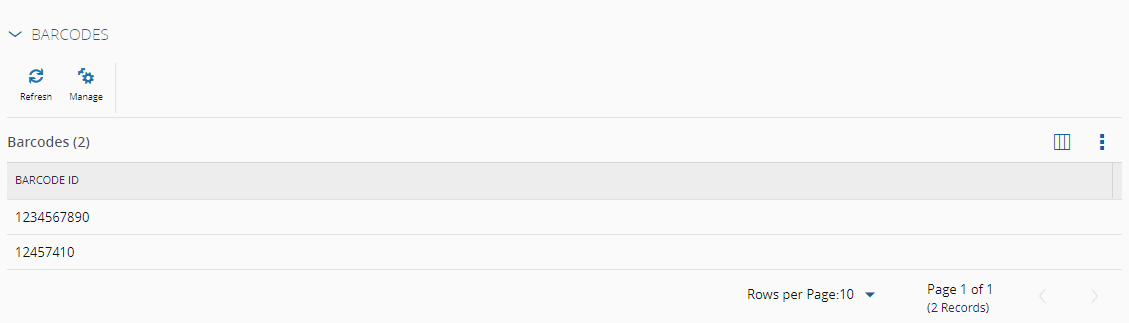 - Choose an appropriate Entity, navigate to the Barcodes section and select the Manage button.