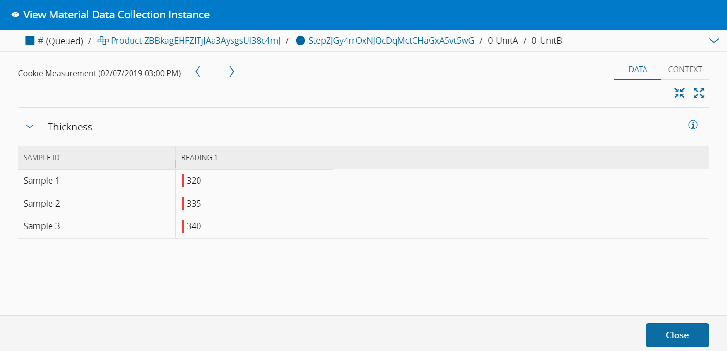 Within this wizard, it is possible to navigate between different Data Collection Instances, by clicking on the arrows, as well as to navigate between the Data and Context tabs, which will display different information.