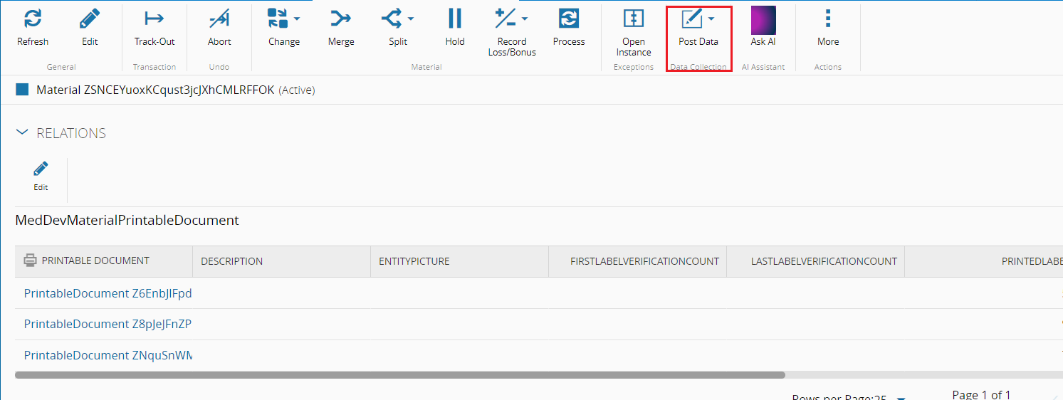 Relation Values Data Collection - Print labels for a material to create the MedDevPrintableDocument relation alt text - Have a reconciliation DC configured in a step - Dispatch and Track In the Material ,then open the DataCollection instance through Post Data alt text - The values are being populated to the DataCollection instance from the MedDevPrintableDocument relation. alt text