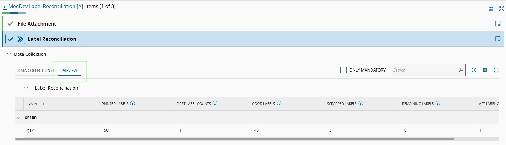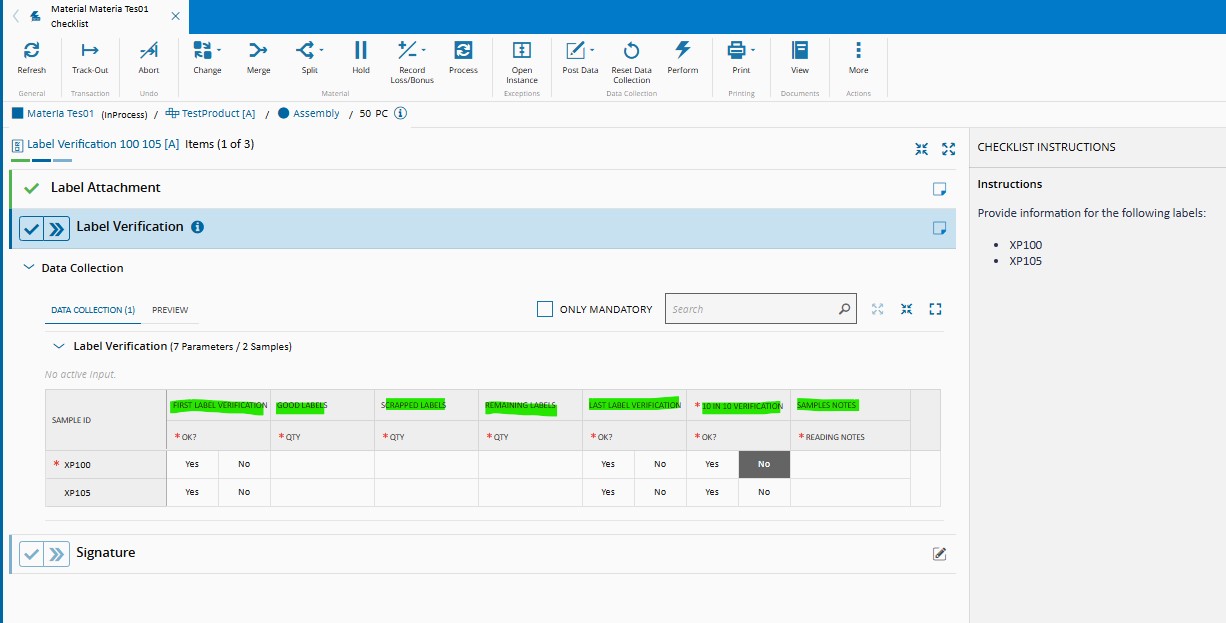 At the reconciliation Data Collection Step, the final values on the relation can be pre-filled in the data collection for final verification and sign off. If missing or unverified labels are detected, these will be recorded in the Material history and Exception protocols can be triggered.
