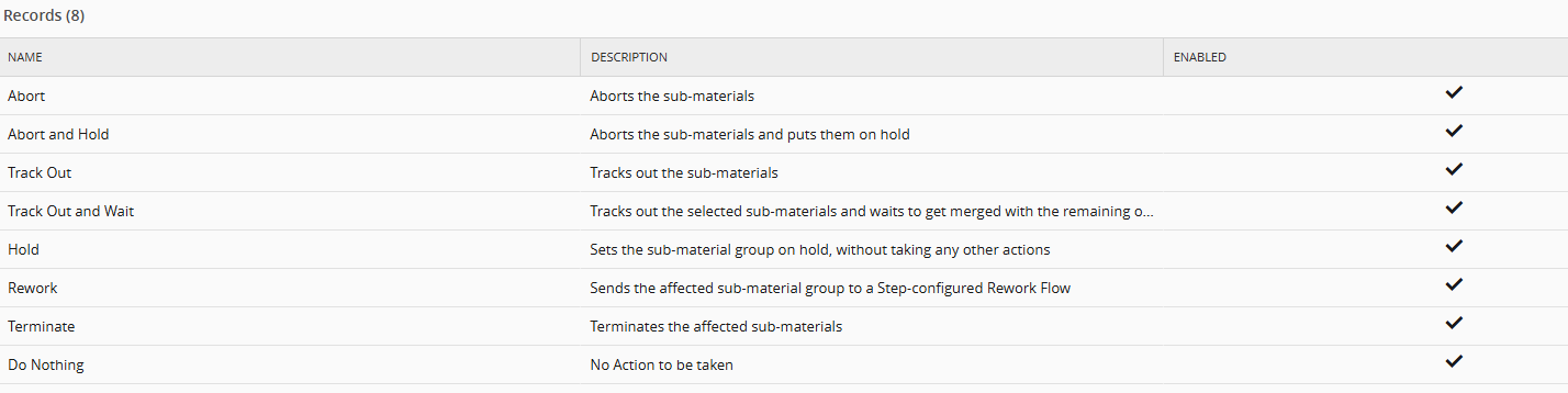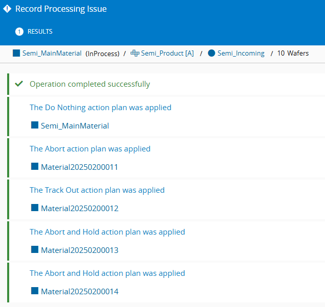 The Action Plans can be configured in the SemiProcessingIssueActionPlans Generic Table. Each Action Plan can contain up to 3 Actions (e.g. Abort + Rework + Hold), and define if the affected materials will be merged back automatically. SemiProcessingIssueActionPlans