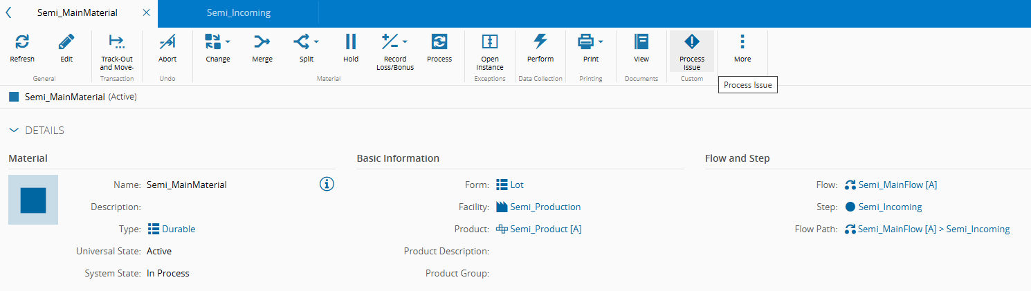For users to open a Processing Issue, there is a new "Process Issue" button on the Material Details, Step and Resource Views, that should be visible when a Material is In Process. Process Issue Button