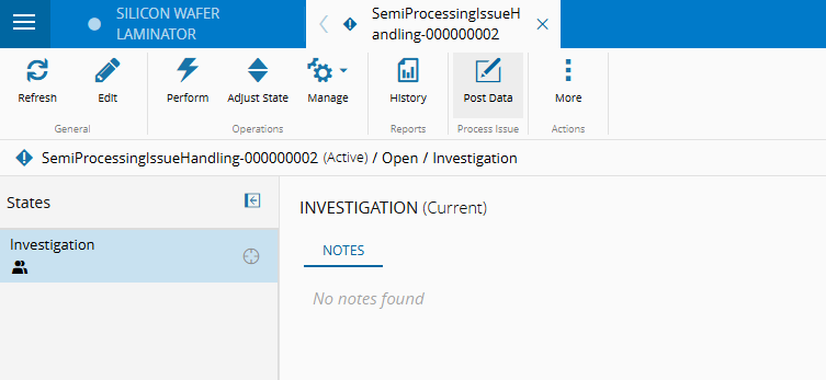 If a protocol was configured to be triggered for any of the submitted sub-material state classifications, the action plans will not be executed immediately, and a new protocol instance will be opened instead. While waiting for the protocol resolution, the Material will remain In Process in MES, and set on Hold (if configured in the SemiProcessingIssueContext table). When executing the protocol, at any stage, there is a new "Post Data" button that allows reviewing and correcting the sub-material state classifications.