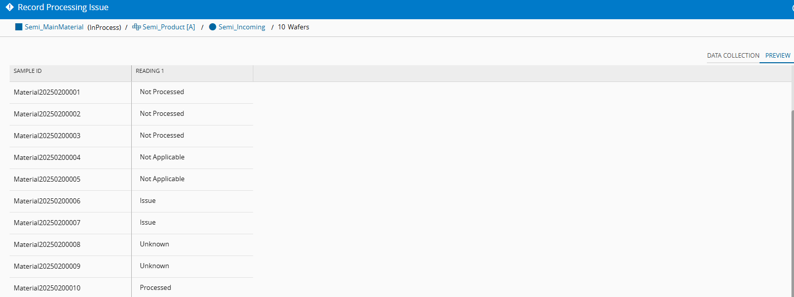 In order to collect information on the state of each sub-material, the logic relies on a Data Collection with specific parameters. The Data collection provides a user interface for users to report processing issues, and can also be filled out automatically via Equipment Integration.