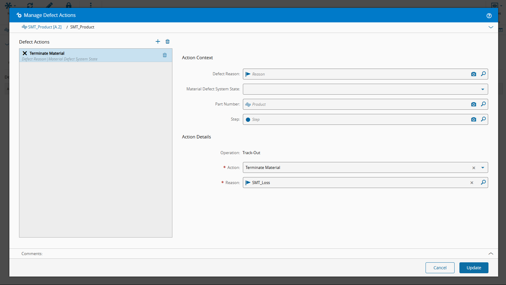 When a material with a Terminate Defect Action has defects recorded against it, and is tracked out, the Terminate Defect Action will be triggered: