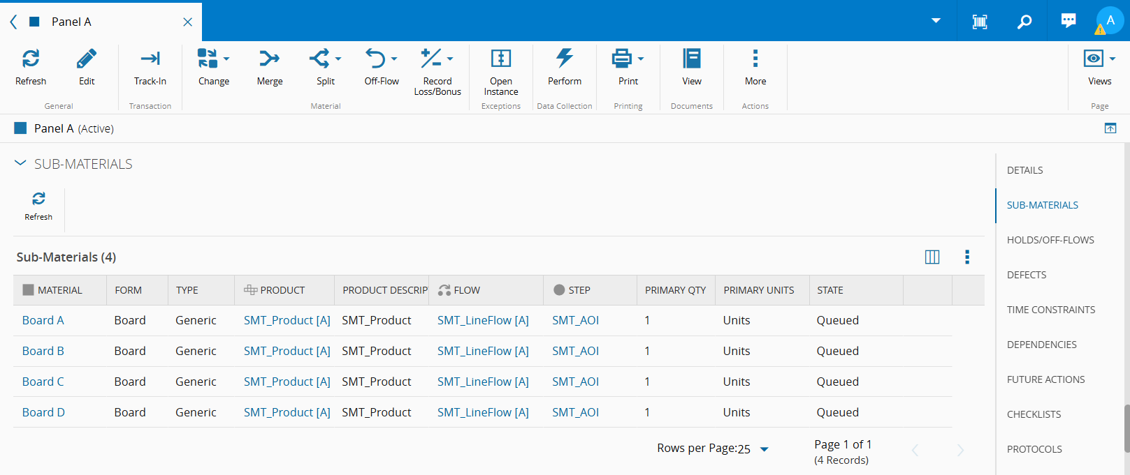 Consider the scenario of a panel with 4 submaterials associated to it, which represent the boards. The boards have MESPositionID equal to 1, 2, 3 and 4, respectively.