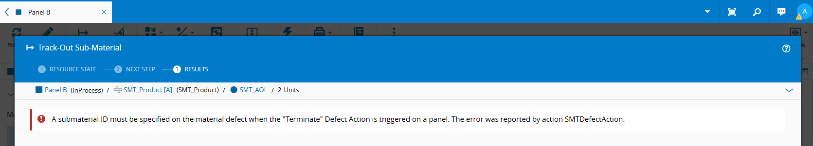 If you try to track out a panel with a defect where no submaterial is specified, you will be presented with the following error message: