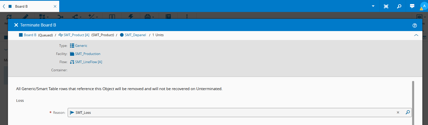 Due to tecnical reasons, the loss reason used by the defect action has to be configured on the step after the step in which the defects were recorded and the Terminate Defect Action triggered. Referring back to our scenario's SMT Line, the step after SMT_AOI is the SMT_Depanel step, and therefore that's the step that must have the SMT_Loss reason correctly configured.