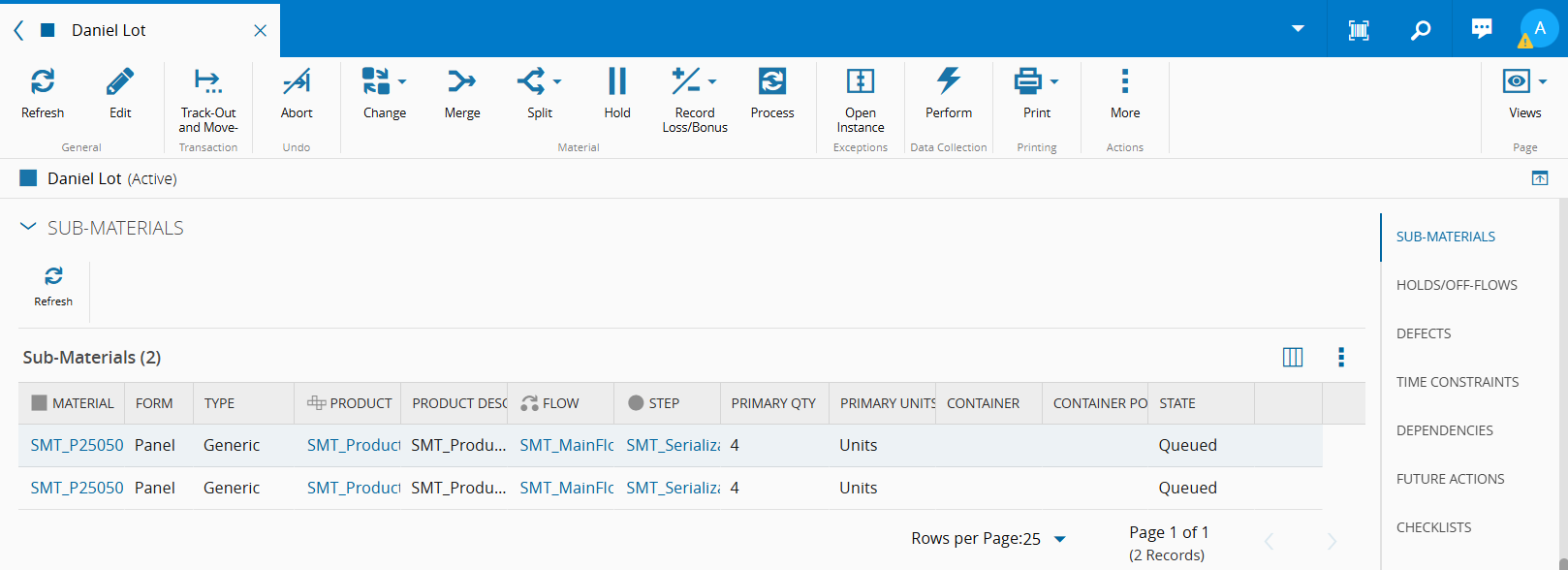 - 1 Lot material with a Primary Quantity of 0 with 3 Sub-Materials