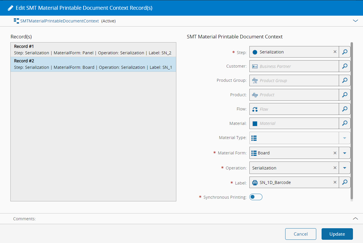 /SMT/MaterialSerialization/- enable the Material Serialization feature/SMT/MaterialNameGeneration/- enable the ability to generate names for the materials/SMT/MaterialAutomaticLabelPrinting/- enable the label-printing functionality of this feature