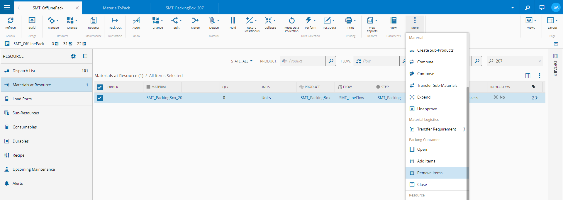 In order to remove the Materials from the Packing Container, the user should go to the Resource View, select the Packing Container, and enter the Remove Items from Packing Container wizard.